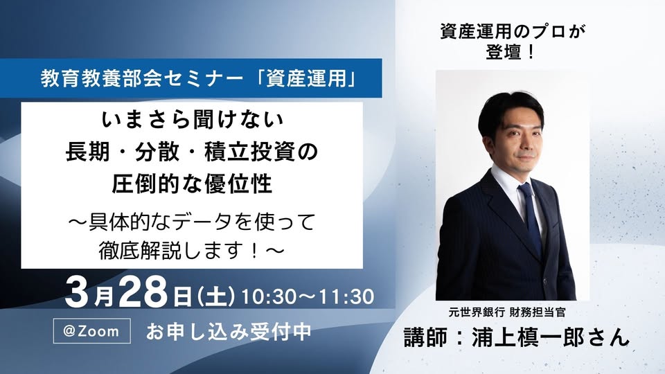3/28【教育教養部会】「いまさら聞けない長期・分散・積立投資の圧倒的な優位性〜具体的なデータを使って徹底解説します!〜」
